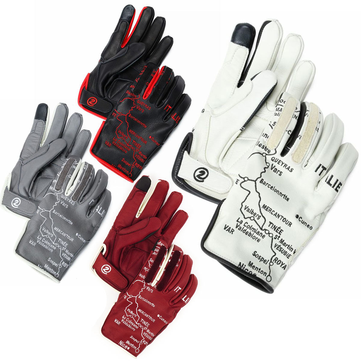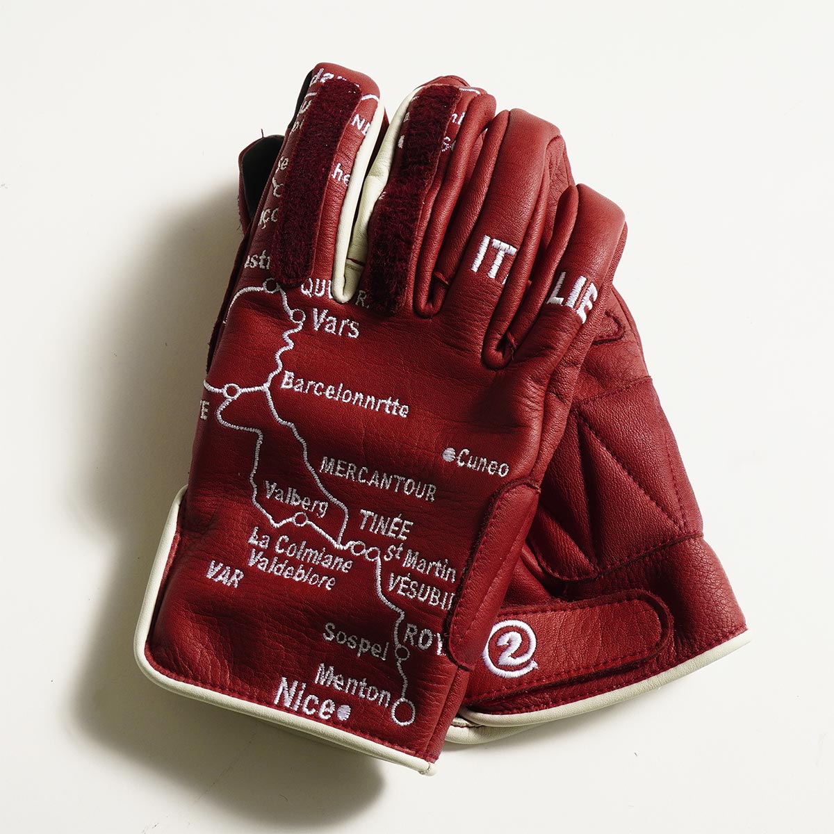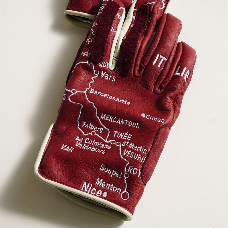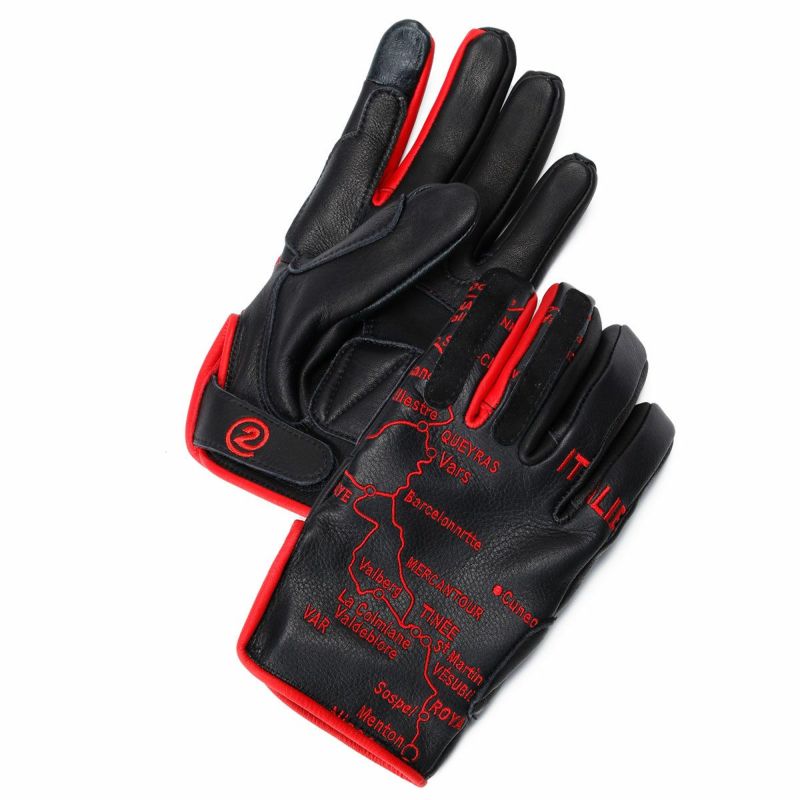グローブの左右に、縦に連なるアルプス山脈の地図が刺繍されており、指先にはバイザーやゴーグルを拭くのに使用可能なレザーが両手の人差し指と中指にレイアウトされています。