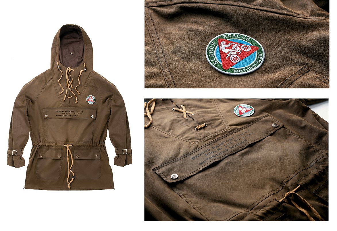 オイルドコットンを採用し、防水・透湿性に優れた”Rescue raincoat”は、20世紀半ばの登山用スモックからインスピレーションを得ており、モーターサイクルジャケットやオフロード用アーマーの上に着用することができます。ミッドセンチュリーの登山用スモックに影響を受けたこのレインコートは、ユニークで時代を超越した美しさを持ち、時が経てばその風合いはよりノスタルジックを際立たせるでしょう。