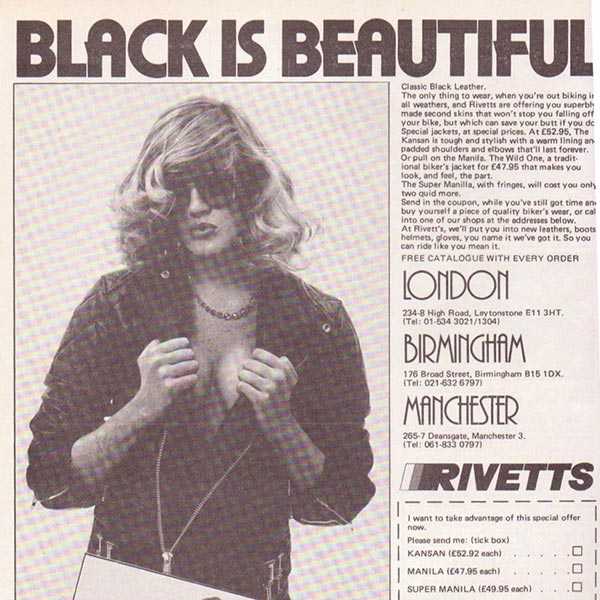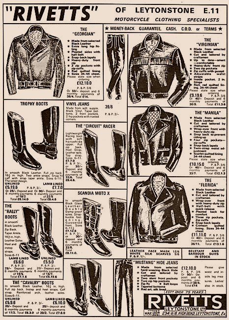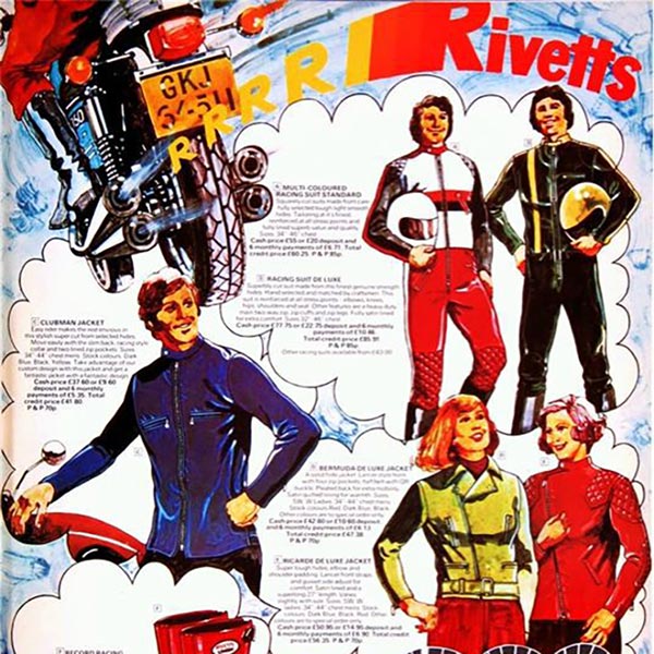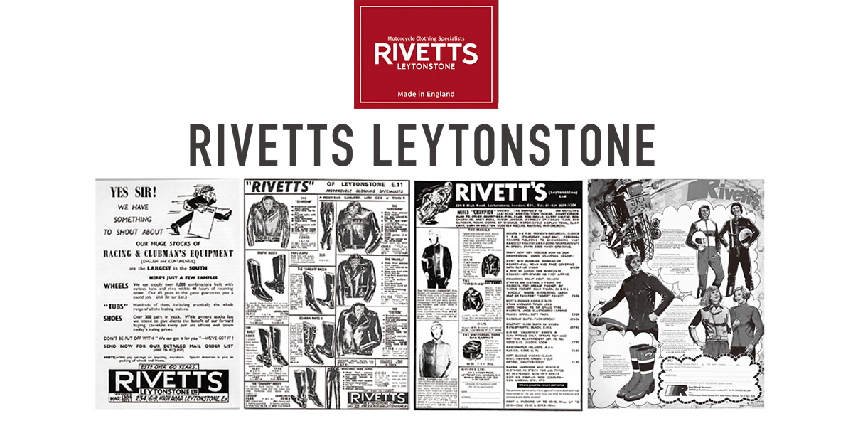 創業当初は自転車の製造を行っていましたが、1930年代にはモーターサイクル及びウエアー・アクセサリーを中心に取り扱い、50年代から「HIGHWAYMAN」ブランドでレザーウエアを製造・販売。60年代初めに自身の名を冠したオリジナルレーベル「RIVETTS」での販売を開始、そのクオリティの良さが評判となり英国を代表するモーターサイクルウエアブランドとなります。
