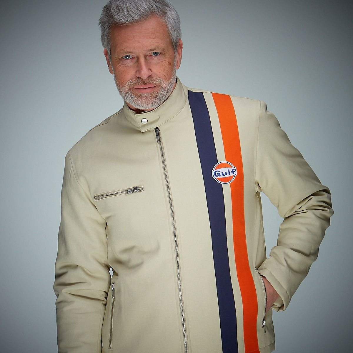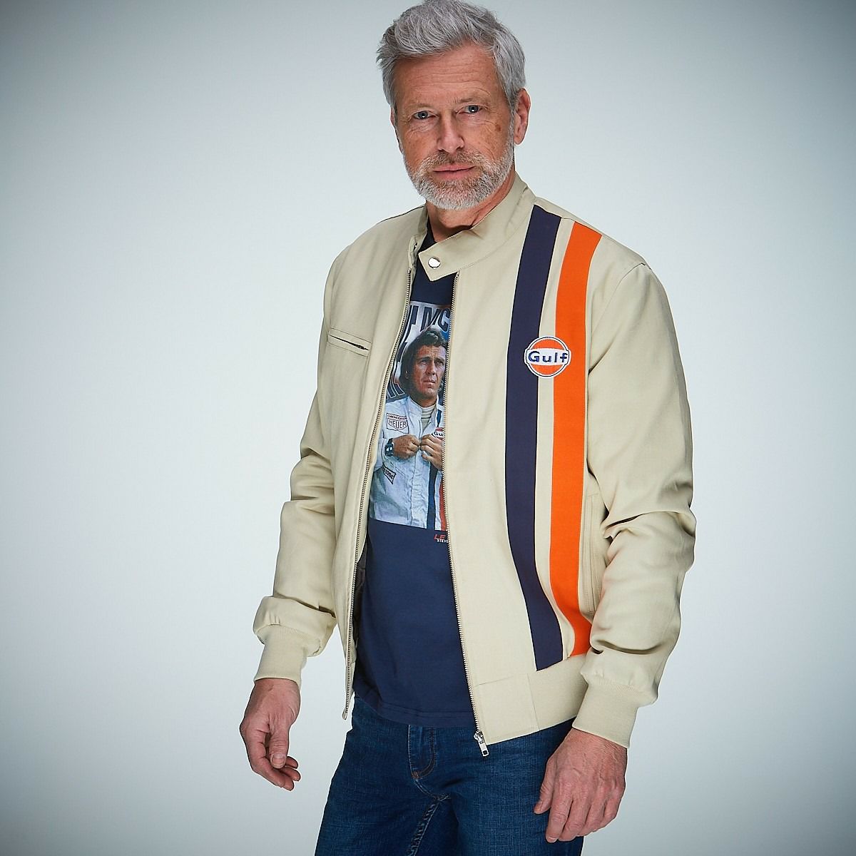 映画「栄光のル・マン」の主人公、M・ディレイニーが着用していた、ガルフのロゴと2本のレーシングストライプが特徴的なレーシングスーツをインスパイアしたブルゾン。