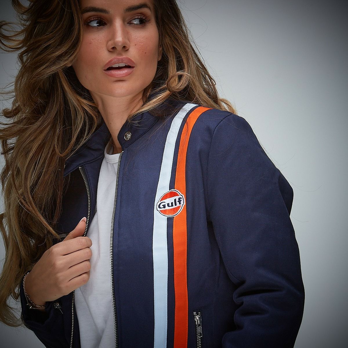 象徴的なGulfカラーのレーシングストライプと、胸元のオレンジのディスクが、クラシカルな中にもモダンなガルフ特有のエッセンスを添えています。