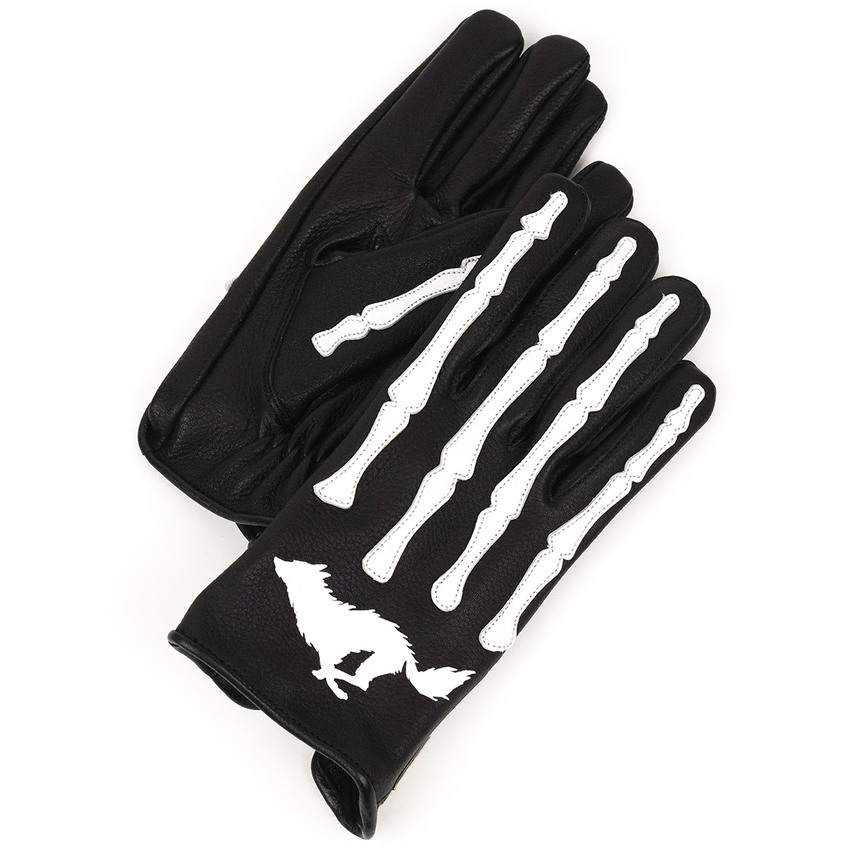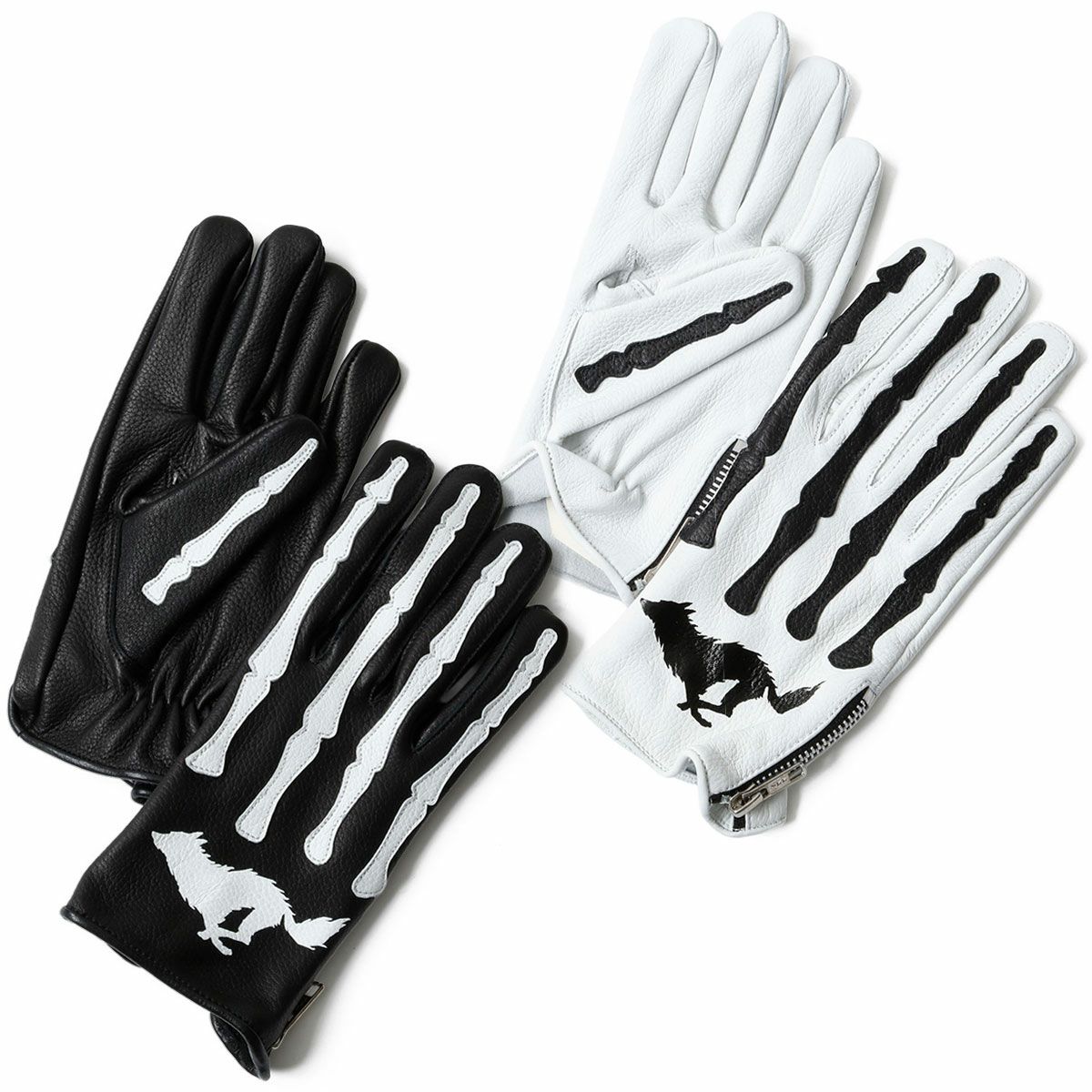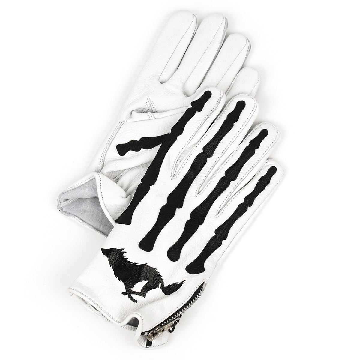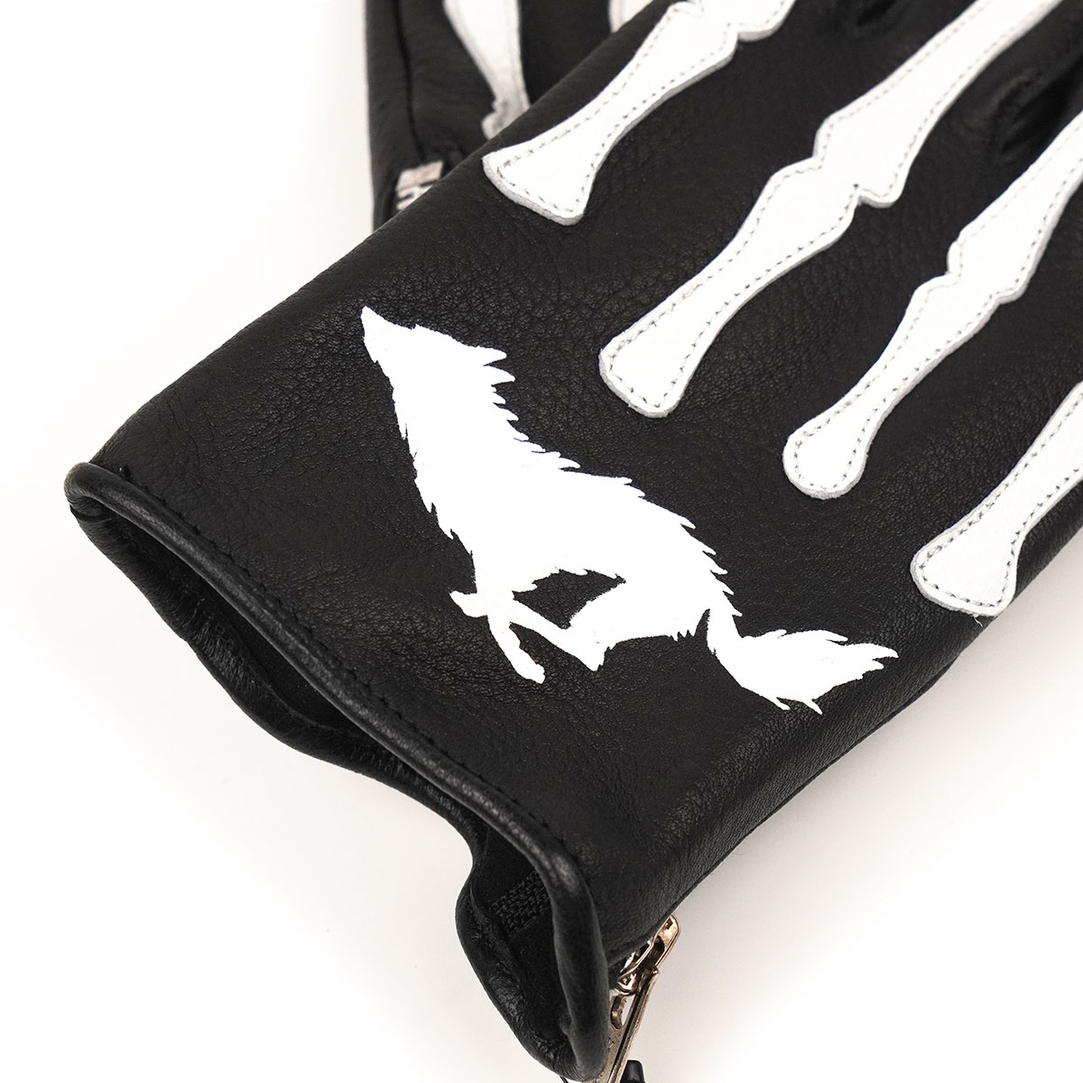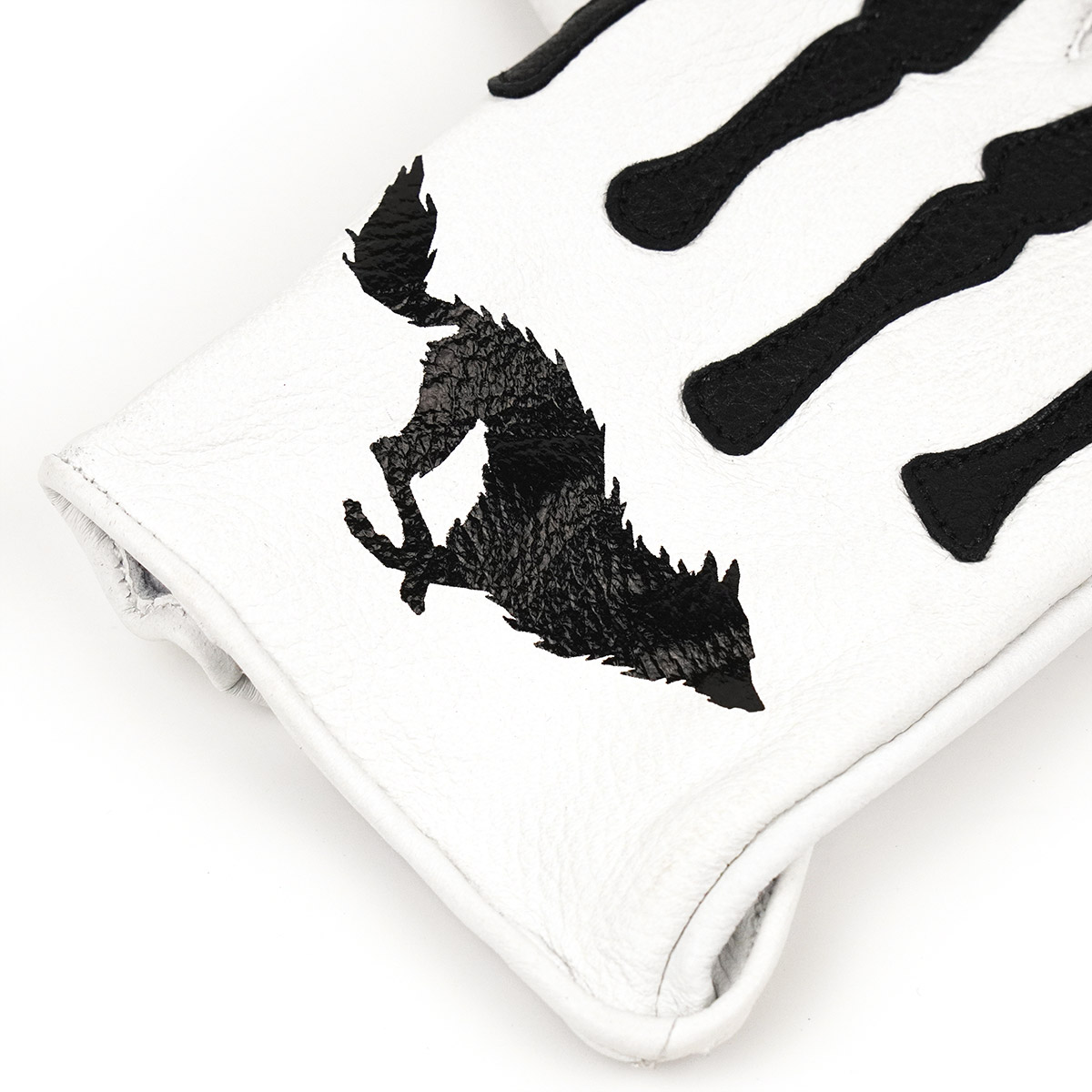 左右のウルフプリントは、見つめあう形で内側に頭が向けられた、対称のデザインとなっております。また、手首はジッパーで着脱を調整することにより、よりフィット感が高まるよう設計されています。