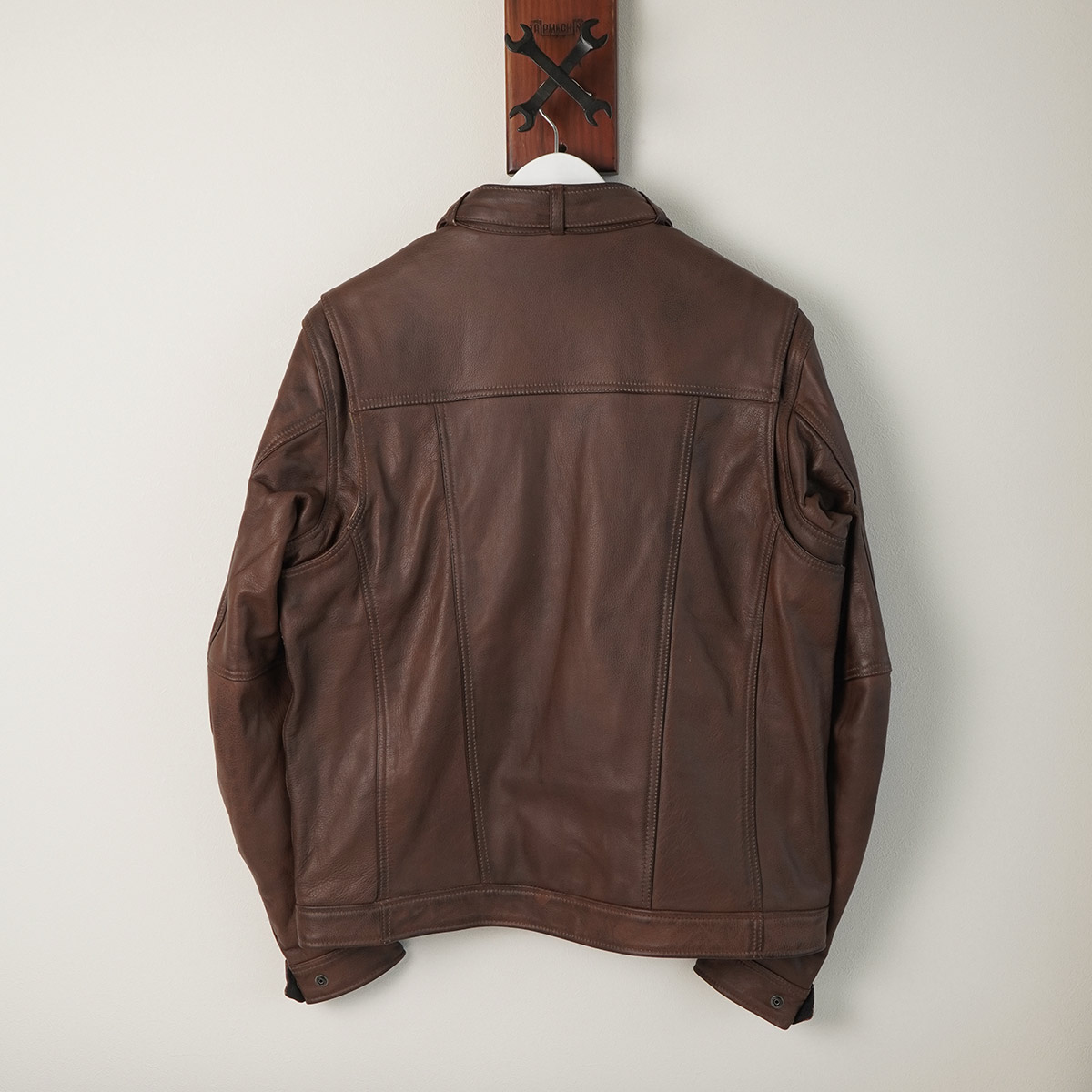 襟元のデザインや、切り返しのパターンなど、一枚革のフラットなレザージャケットとは異なり、ヴィンテージジャケットとしての印象も強い1着。オフィシャルには80年台風と謳われているデザインですが、不思議と60s/70sの雰囲気も感じる仕上りが、着る人を選ばない魅力としてオーラを放っています。