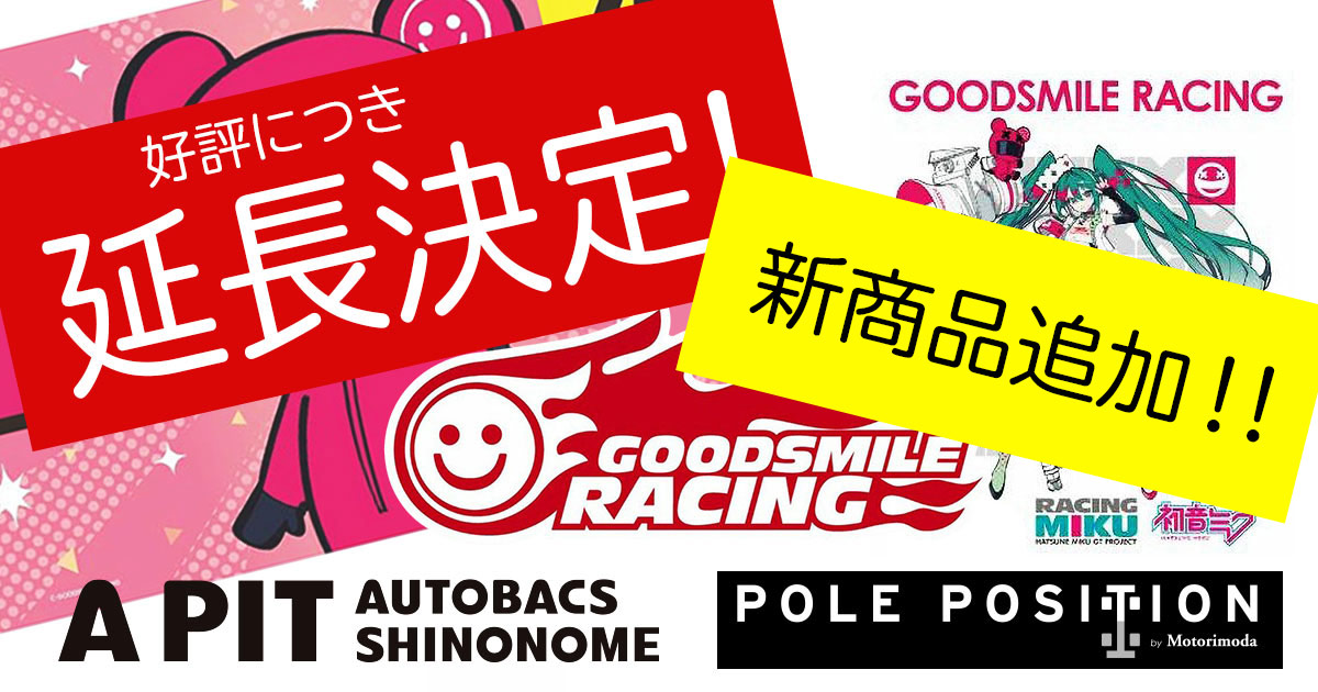 モータースポーツの成長を新たらしい方向性で牽引する“グッドスマイルレーシング”の公式グッズは「Pole Position by Motorimoda A PIT AUTOBACS 東雲店」で展開中。