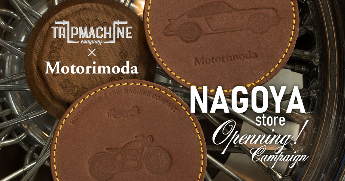名古屋店ではグランドオープンに伴い、『Trip Machine × Motorimoda』の特製レザーコースターをプレゼントする、オープニングキャンペーンの開催が決定。こちらは近隣エリアの皆様に送付されたDMをご持参+お買い物をしていただくと、先着でコースターをプレゼントする内容となっております。