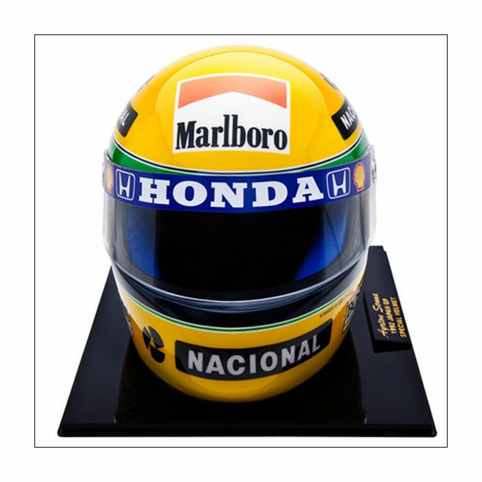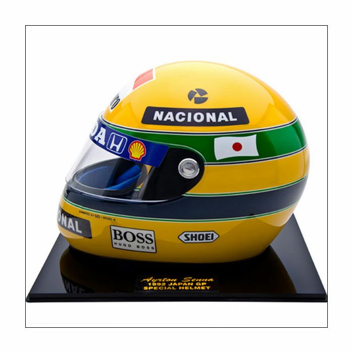 1992年日本グランプリ仕様のヘルメットは、この年限りでホンダがF1撤退を表明したため、セナのホンダに対する敬意として、日本の国旗がヘルメットにあしらわれたスペシャルモデル。もちろんペイントは一点一点ハンドペイント。