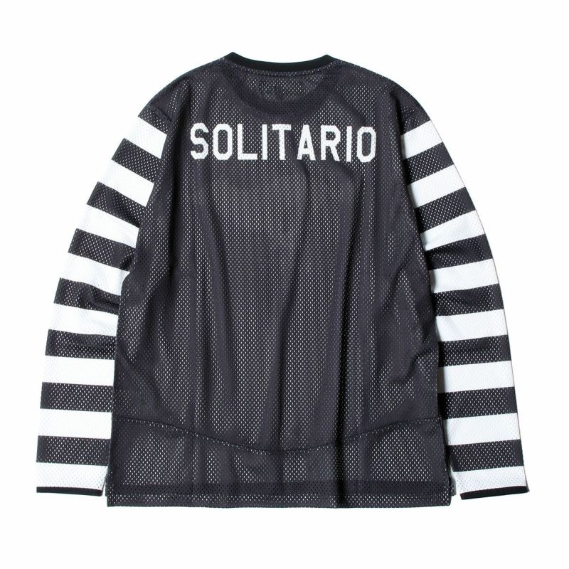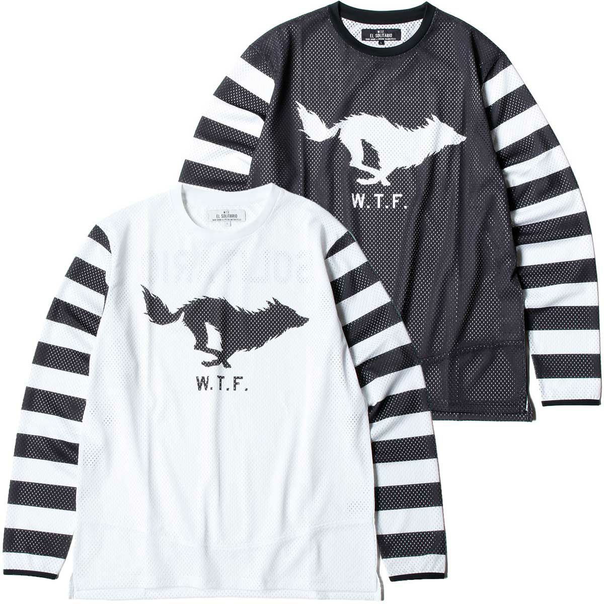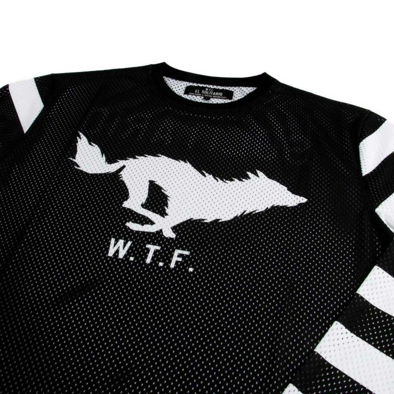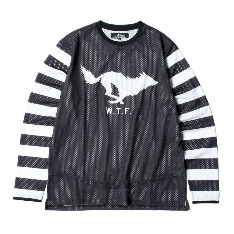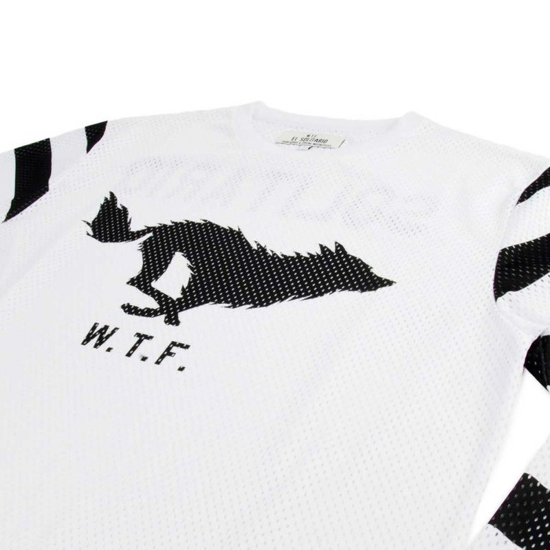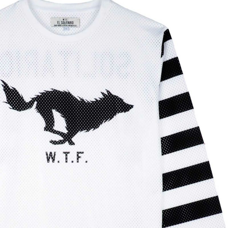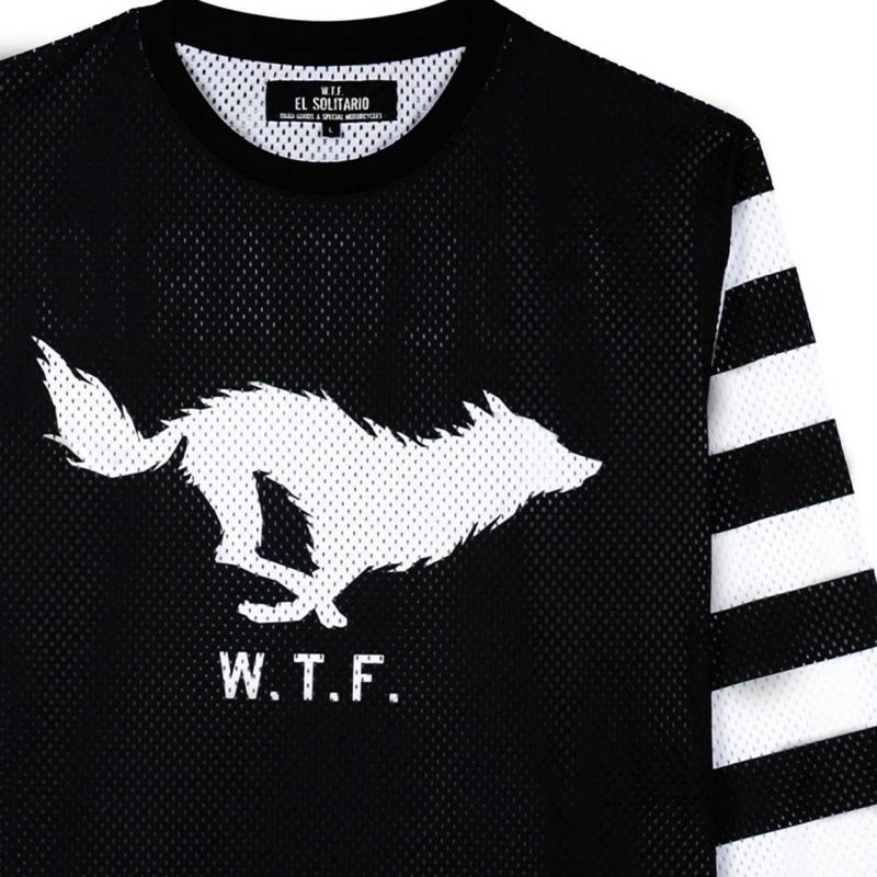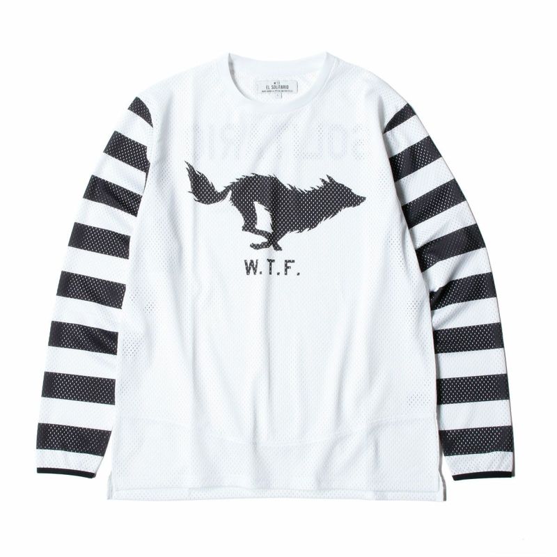 ボディにはブランドアイコンのウルフのロゴがプリントされ、袖にはストライプがあしらわれたモトクロスジャージー。
