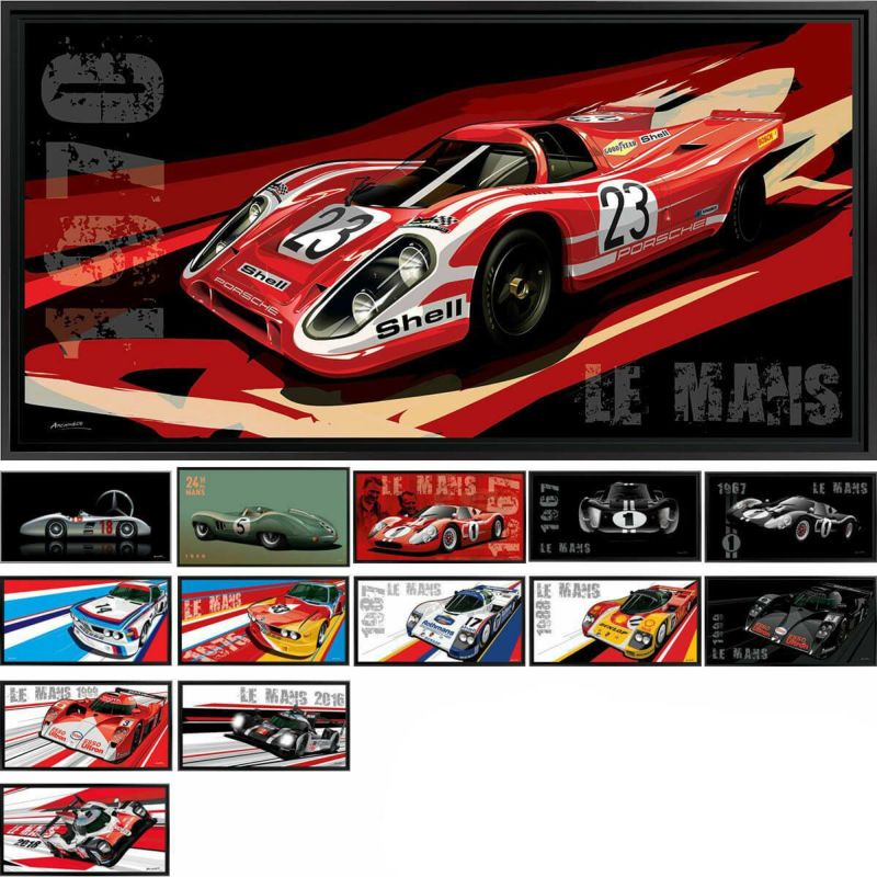 ル・マン24時間レースを制した歴代のウィナーマシンをはじめとする、様々な激闘を繰り広げてきたマシンが描かれた、ル・マン24時間レース公認のイラストパネル「CAR & NOIR」コレクション。このデザインを手掛けるのは、フランスで自動車イラストレーターとして活躍する Dominique Donné(ドミニク・ドネ)氏。アメリカンボックスと呼ばれる額縁(フレーム)をベースに、ウッドラミネート製法を用いたイラストパネルをフレームの内側にはめ込む独特な製法は、オーラや迫力がひしひしと伝わるよう、どの角度からも見やすいように仕上げられています。また、フレームの裏には、ル・マン24時間レース公式アイテムの証であるホログラムつき。