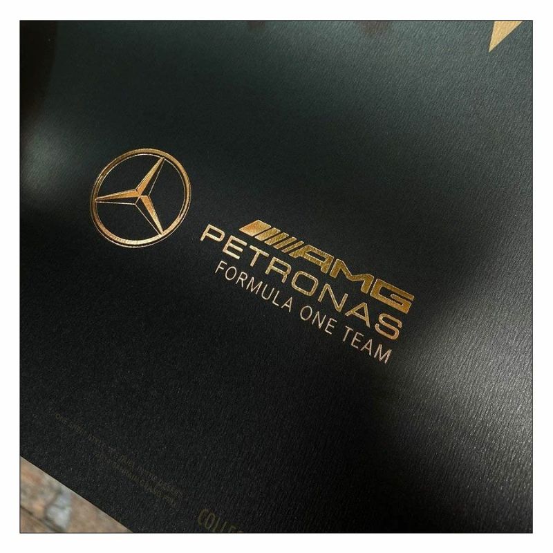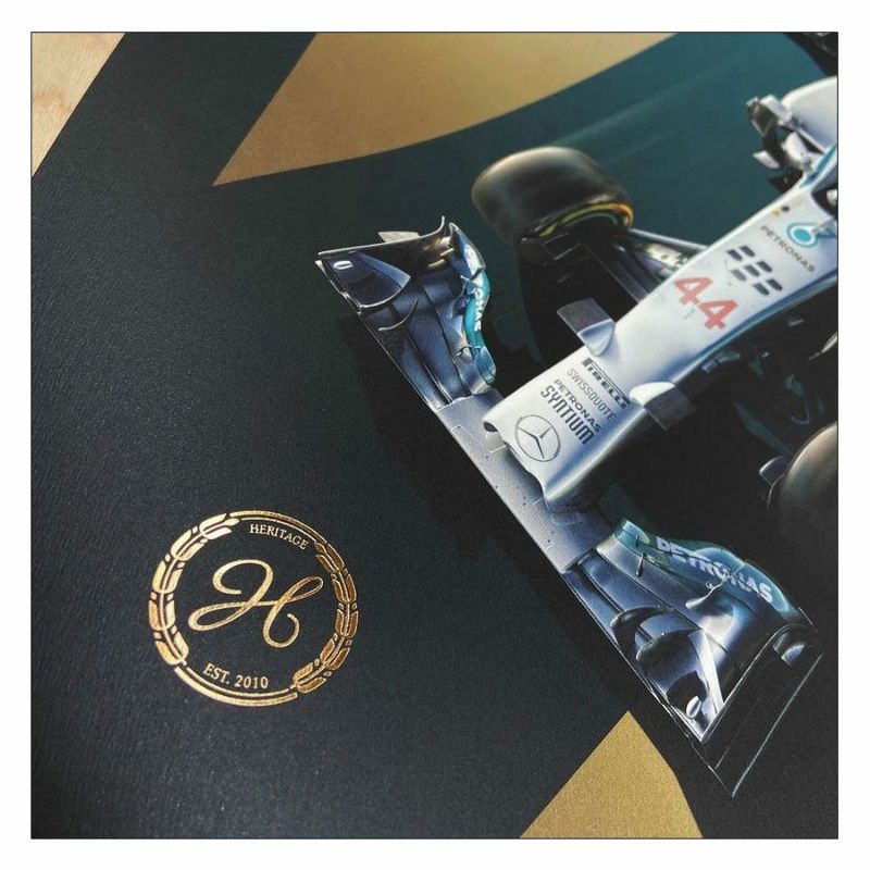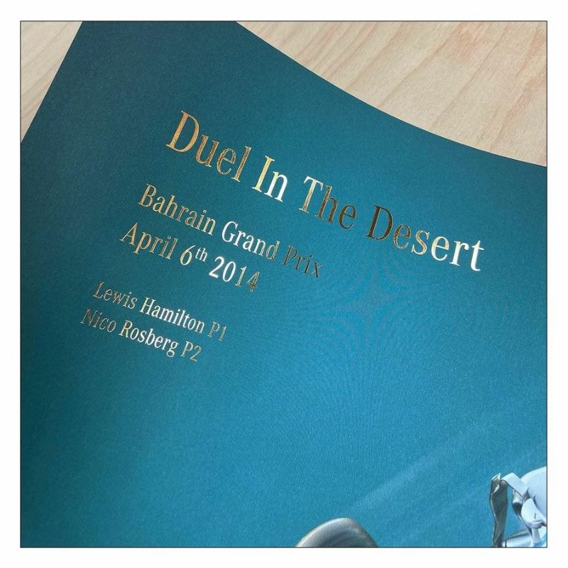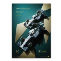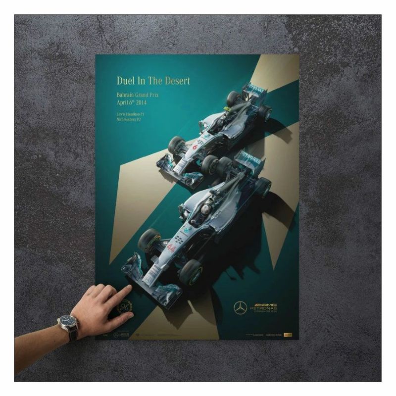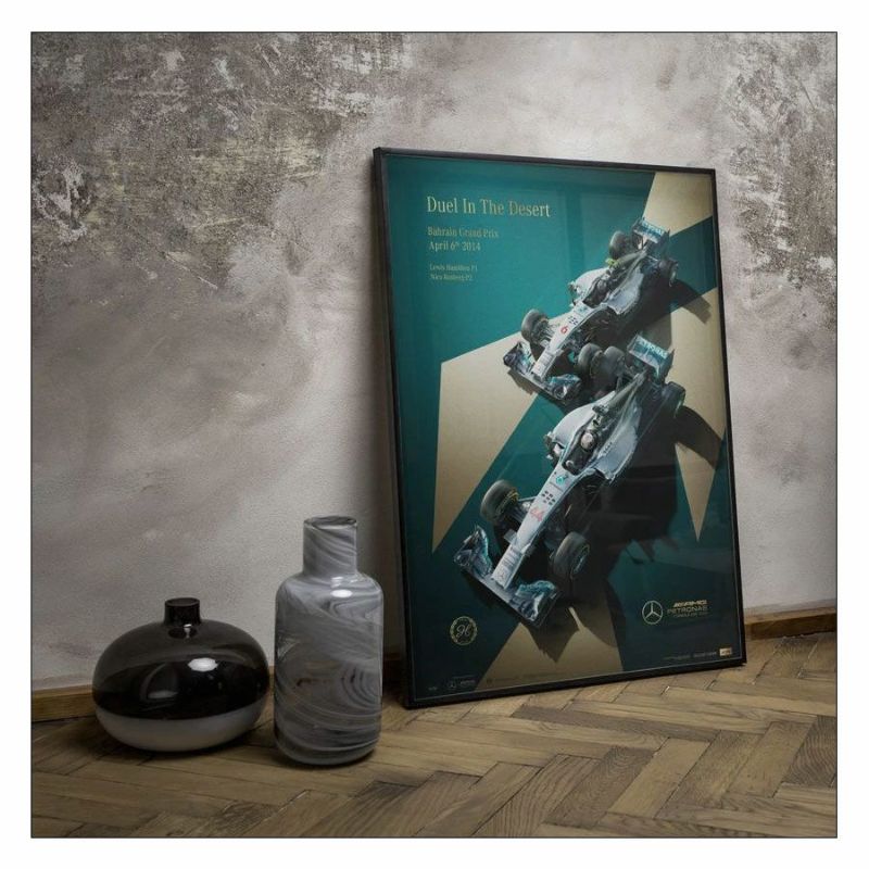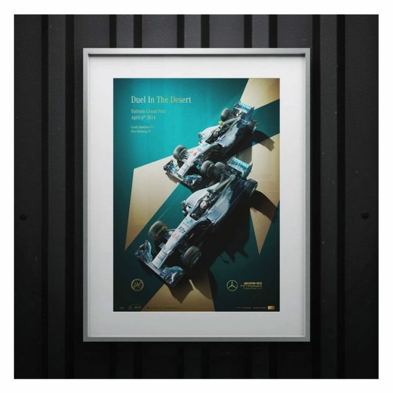 ルイス・ハミルトンとニコ・ロズベルグがドライブする、メルセデスAMG F1 W05がホイールtoホイールに描かれた2014年バーレーンGP仕様のポスター。