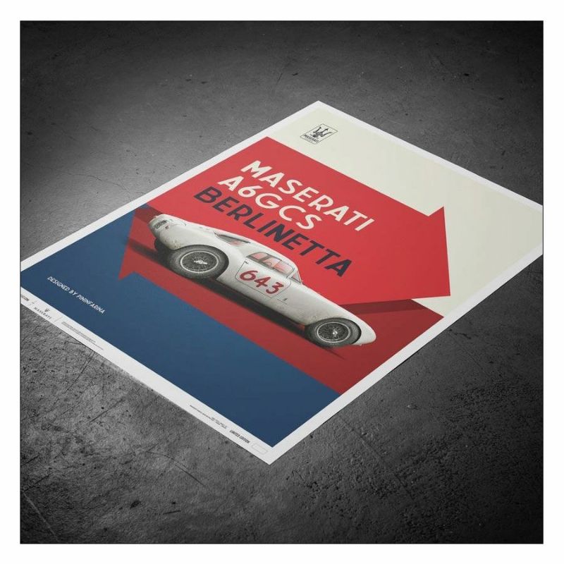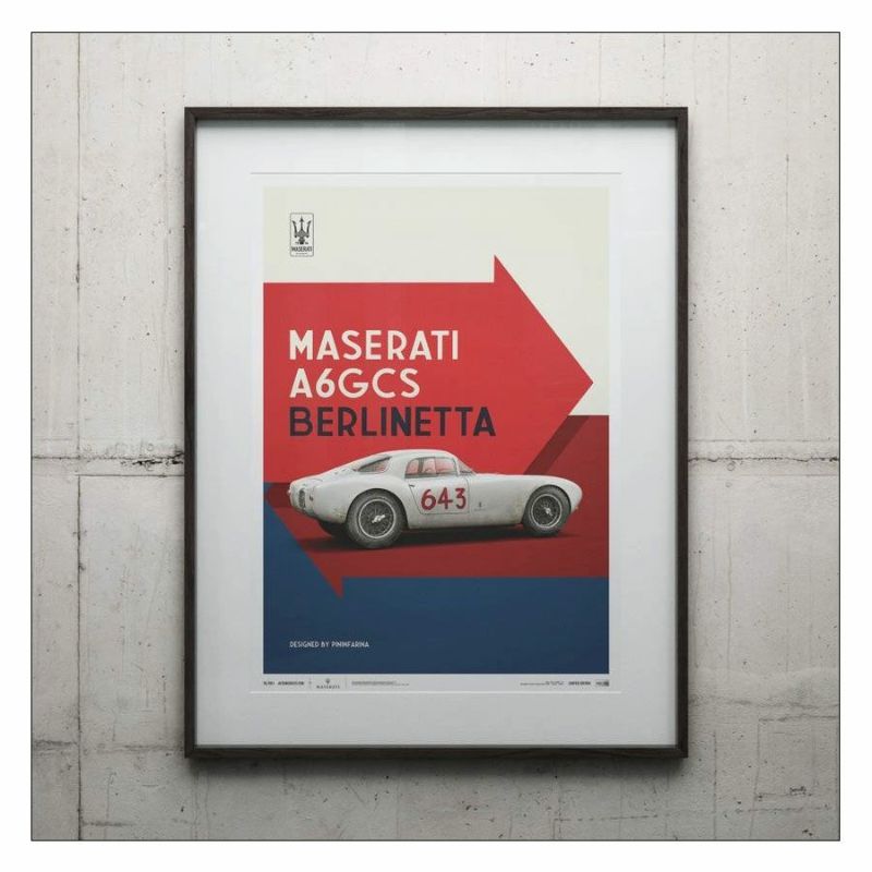 1954年のパリモーターショーに出展されたのち、アルベルト・マージ・ディリジェンティ伯爵の手に渡り、1955年のミッレミリアにおいて、総合109位、クラス13位というリザルトを残した、マセラティ A6GCS Berlinetta Coupeのポスター。
