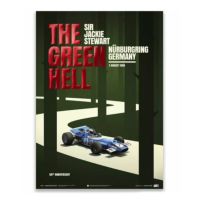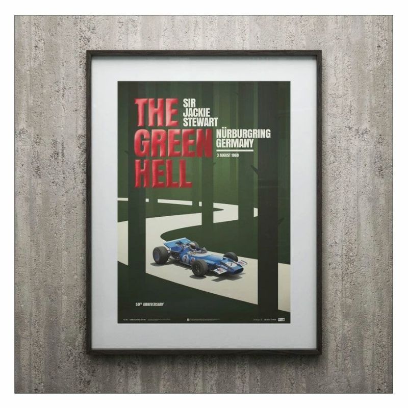 このメモリアル・ポスターには、ノルドシュライフェのテクニカルセクションをマトラMS80と共に駆け抜けるスチュワートが描かれていますが、その光景はどこか孤独で寂しげなイメージ。そして、光沢感のある赤い色で描かれた"THE GREEN HELL"という文字はまさに血の色・・・常にレースは死と隣り合わせだったといったイメージを連想させる1枚です。