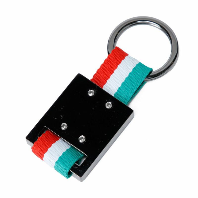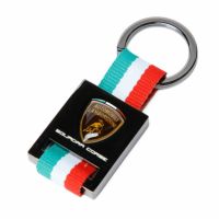ランボルギーニのエンブレムがあしらわれた四角いプレートにトリコロールのナイロンベルトが通されたオシャレなキーリング。