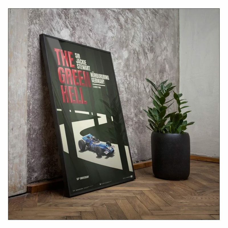 このメモリアル・ポスターには、ノルドシュライフェのテクニカルセクションをマトラMS80と共に駆け抜けるスチュワートが描かれていますが、その光景はどこか孤独で寂しげなイメージ。そして、光沢感のある赤い色で描かれた"THE GREEN HELL"という文字はまさに血の色・・・常にレースは死と隣り合わせだったといったイメージを連想させる1枚です。