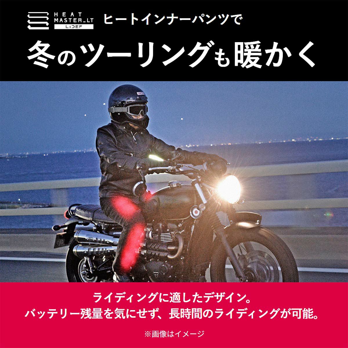 LTシリーズのインナーパンツには、カーボンナノチューブフィルムヒーターを膝部前面に搭載。曲げ伸ばしの動きが多い膝部でも、薄くしなやかなフィルムヒーターとストレッチ性のある素材でスムーズな動きと乗車姿勢を確保。後面には伸縮性と通気性を兼ね備えたストレッチスムース素材を採用し、身体へのフィット感も抜群です。
