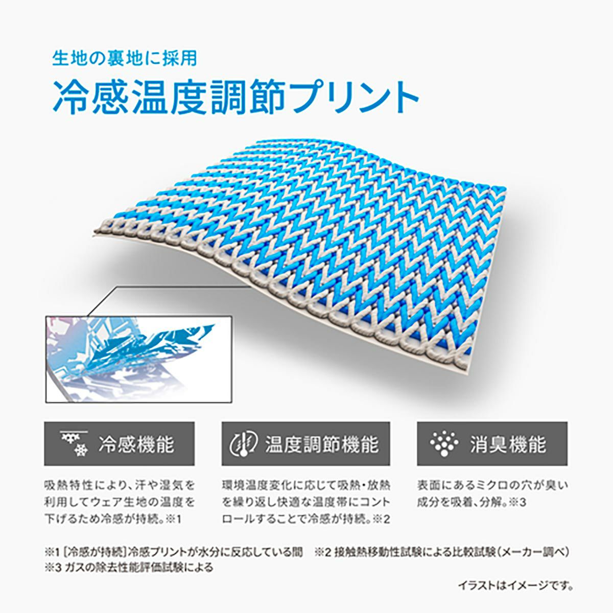 3. 従来品よりもパワーアップした冷感温度調節プリント。冷感機能+消臭機能に加え、新たに温度調節機能が加わることで、生地温度の上昇を防ぎながら汗と風で驚きの冷感が持続します。