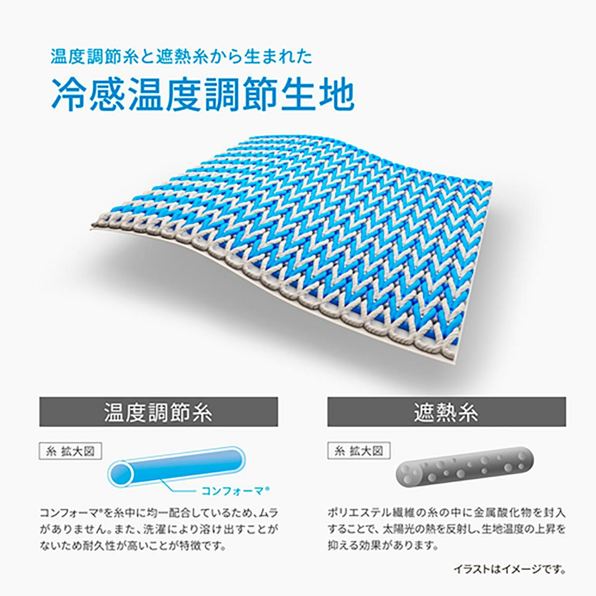 1. 温度調節糸/住友化学が世界で初めて開発に成功した温度調節繊維コンフォーマ®」を生地素材に採用。