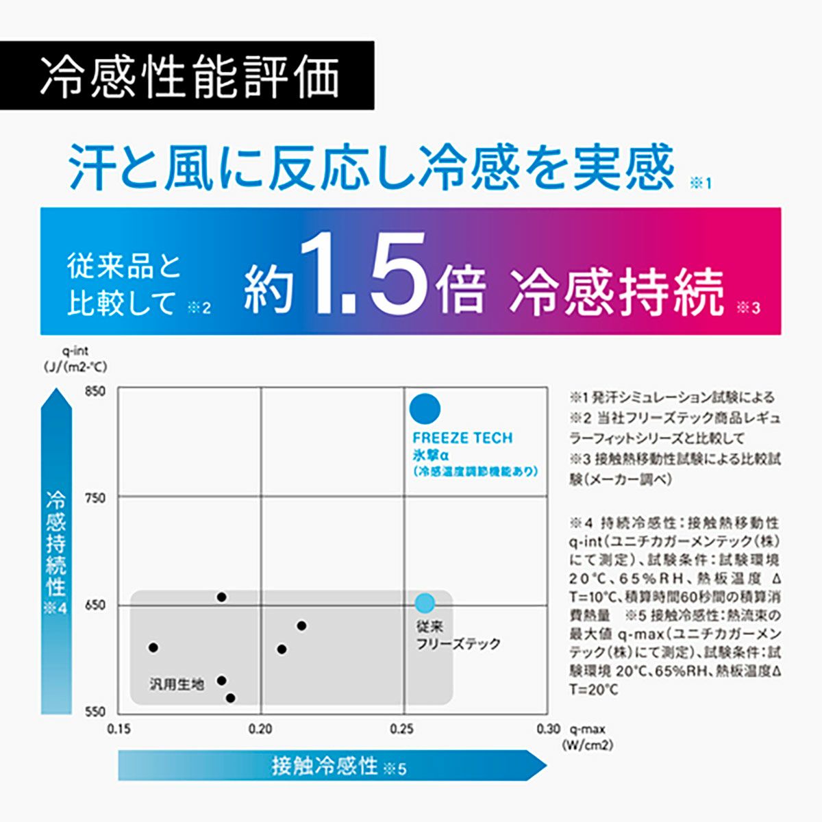 先進技術を結集させたことで素材自体が衣服内温度の上昇を自動コントロール。これにより酷暑環境や体温上昇などで熱せられる。衣服内温度を快適域である26~32℃に近づける効果により、氷撃冷感プリントの冷感効果を実感しやすくなりました。(冷感持続は従来品の1.5倍)