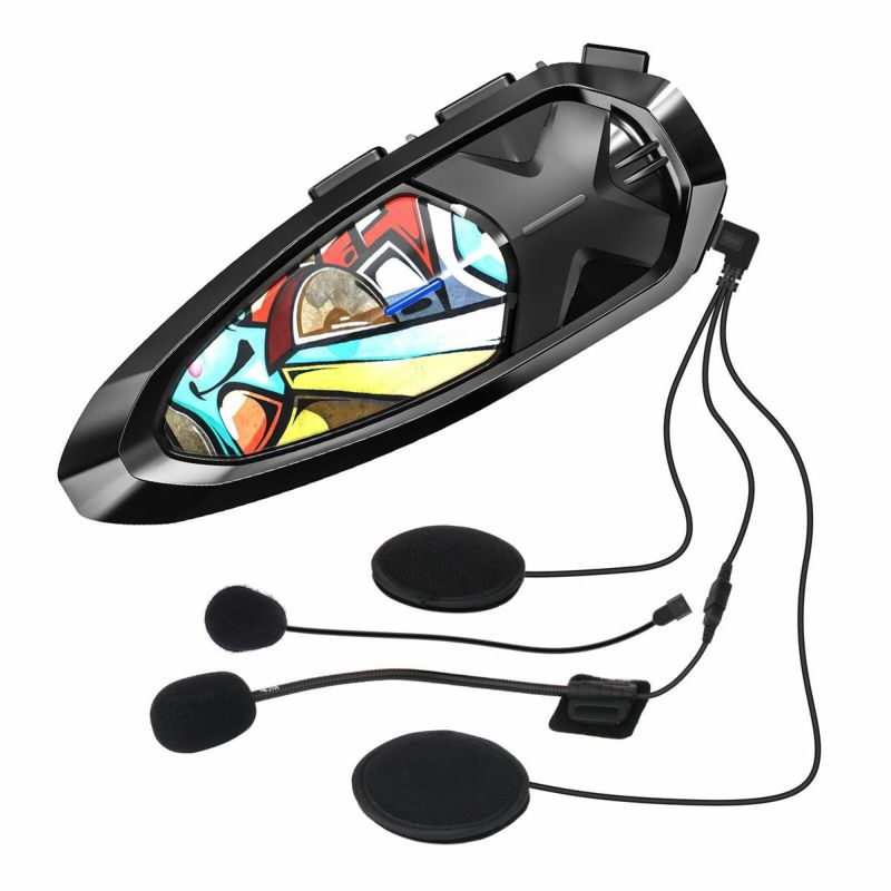 Bluetooth5.0接続で高速道路走行時の通信距離約2km(市街地約600m)。10人同時通話が可能で、インカムのフェイスプレートが変更できる5色のオプションプレートが付属しています。