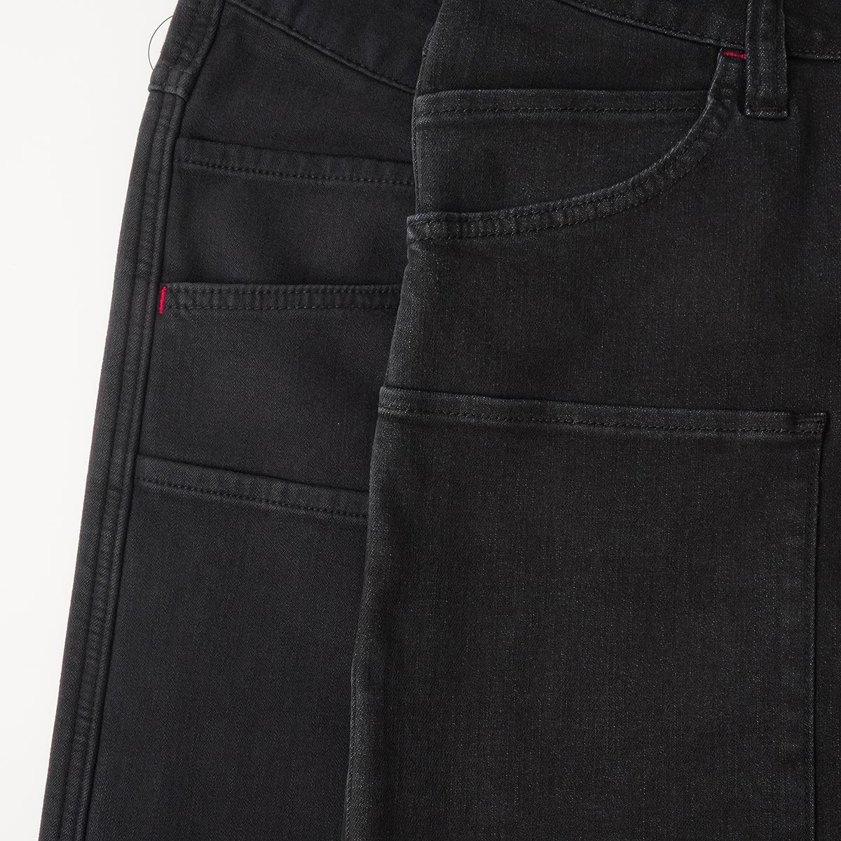 ざらついたデニムの様な生地感の通常モデルは、履いた時もしっかりとした印象です。クールよりは若干固い生地ではありますが、ストレッチ性能によりストレスは全くなく、履きやすい仕上がりに。