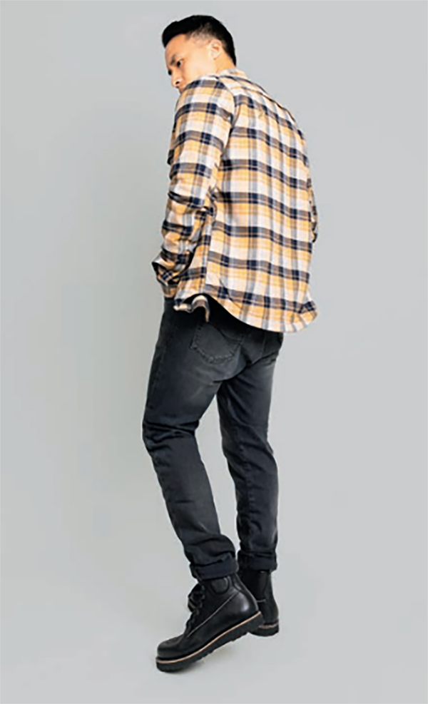 モノトーンのコーディネートに飽きたら、カラーシャツにチャレンジ。暗めのパンツには明るいチェックを差し込んで。足元はしっかりとした重厚感のあるブーツをチョイスすれば、秋冬も対応可能なカジュアルスタイリングの完成。春先はメッシュジャケット、冬はレザージャケットで決まりです。