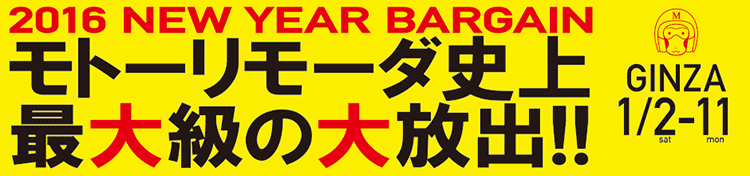 2015/12/22 年末年始の営業について Motorimoda銀座、名古屋、神戸、LUCE各店では、下記の通り年末年始の休業日といたします。 ※ 西武渋谷店は年中無休 年末年始休業日 2015年12月28日(月)~2016年1月1日(金) 年始 銀座、神戸、LU […]