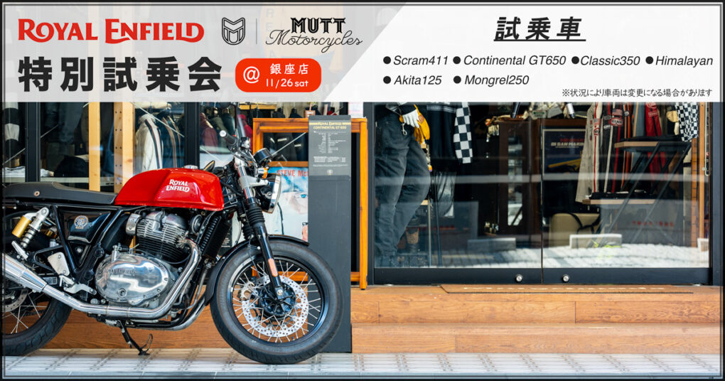 Royal Enfield & Mutt Motorcycles 特別試乗会@銀座 開催のお知らせ 銀座店では久々となる試乗会を実施いたします。今回ご用意するのはRoyal EnfieldとMutt Motorcyclesの2メーカー、合計6車種。普通二輪免許で乗車可能なモデルもございます。 予約制ではございませんので […] 2022/11/18 イベント
