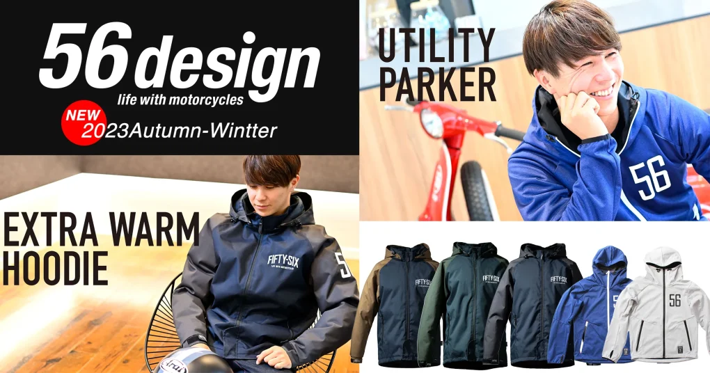 56design | 23年秋冬の新作モデルが出揃いました 「56design」待望の23年秋冬コレクション、後発組がついに登場しました。今回入荷したのは、圧倒的な保温性を持つEXTRA WARM HOODIE、インナーウェアとして最適なUTILITY PARKER、そして肌寒さ […] 2023/10/04 バイク関連記事